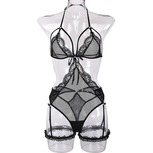 L2125 - 3pc High Waist Garter Laced Panty & Halter