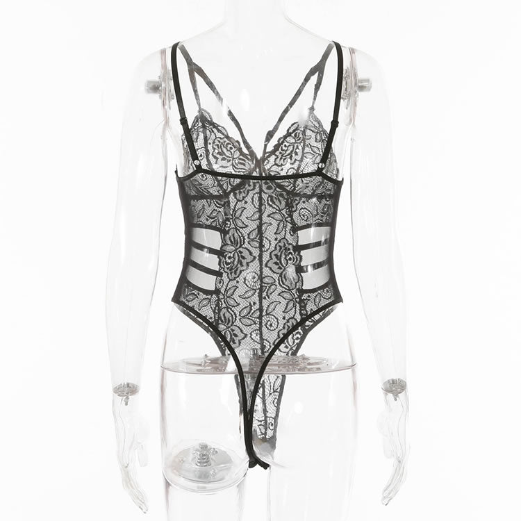 You'seductive teddy featuring sheer scalloped lace cups, a strappy bust detail, adjustable spaghetti straps, a cut-out lace bodice, a high cut leg, a snap crotch, and a thong cut back.